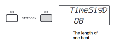 - Press the CATEGORY [>>] button once to call up “TimeSigD” (Time Signature Denominator).The length of one beat is shown on the display